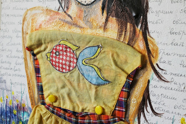 Лицо было создано на бумаге А4. Потом мне перенравилось и я приклеила его на фанеру. Хотела было рисовать дальше, но поняла, что будет слишком просто. Так на картине появилось детское платице. Кажется, я его даже носила, когда была малявкой.